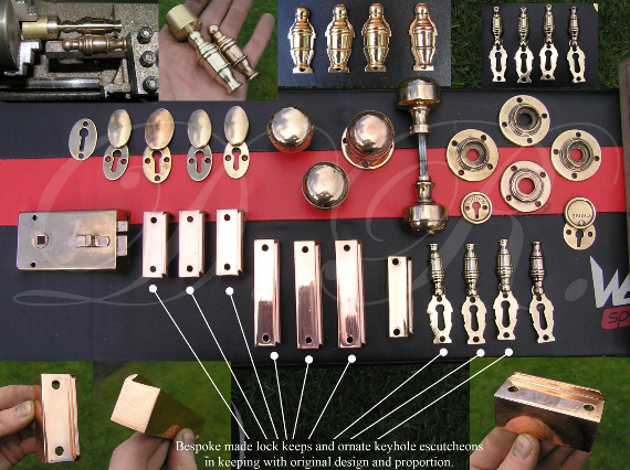 2) The bespoke manufacture of a selection of ornate Brass hardware such as escutcheons and keeps made to look like original Gibbons hardware.